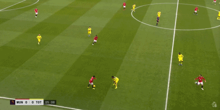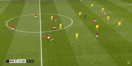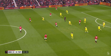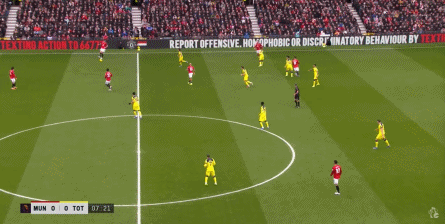 宽泛地说,你也可以认为曼联在有球时转变为了三后卫,但除了阿玛德-迪亚洛并不深度和严格参与防守以外,在对阵热刺的这场比赛,达洛特的上前进攻次数也不少: