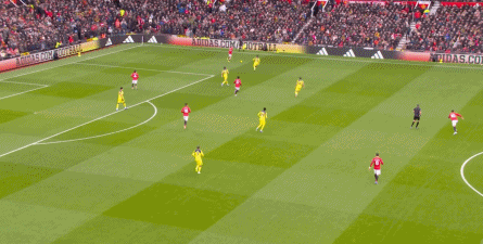 这显然是严格遵循三后卫站位的阿莫林时代不会出现的,更不是约罗打在马奎尔身侧时会常规出现的内容。